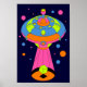 illustration dynamique et stylisée avec une soucoupe volante à plusieurs niveaux survolant dans un cadre bleu foncé. L'OVNI lui-même est rendu dans des tons gras de bleu, rose chaud, vert néon et orange, avec de nombreuses fenêtres circulaires et une structure distinctive sur le dessus. Un large faisceau lumineux rose émane vers le bas de la soucoupe. Suspendu à l'intérieur de ce faisceau est un cube vert néon, placé juste au-dessus d'une forme de losange orange dessinée en noir. L'arrière - plan est peuplé de formes circulaires éparpillées dans des couleurs vives, ajoutant à l'atmosphère cosmique et psychédélique. L'oeuvre a un style plat et graphique avec des contours forts, rappelant la science-fiction rétro et l'art pop. (dessiné par freepik)