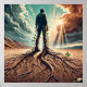Une oeuvre d'art puissante et passionnante qui représente une figure humaine debout dans un paysage stérile, mais au lieu de jambes, elles ont des racines profondes et complexes qui poussent dans la terre. Le contraste entre le sol sec et fissuré et les feuilles verts émergents symbolise la résilience, la transformation et le lien intrinsèque entre l'humanité et la nature. Le perçage de la lumière du soleil à travers les nuages évoque l'espoir et le renouveau, faisant de cette pièce une métaphore visuelle profonde pour la croissance et l'appartenance.