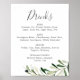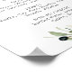 Cette enseigne de menu de boissons de mariage à la branche d'olive moderne est parfaite pour un mariage bohème. Le design rustique mais élégant présente des feuilles vertes botaniques aquarelles simples et des olives noires sur une petite branche avec une ambiance méditerranéenne classique.
