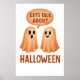 Deux fantômes de dessins animés avec des expressions différentes s'engagent dans une conversation. Au-dessus d'eux, une bulle de discours dit "Parlons d'Halloween".