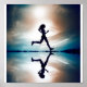 La silhouette de coureur féminine est reflétée ci-dessous avec un ciel doux et pastel comme toile de fond