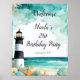 Belle affiche de fête d'anniversaire avec un phare noir et blanc nautique, étoiles de mer et coquillages. Parfait pour une fête d'anniversaire. Les mots peuvent être changés en fonction de vos propres détails ou exigences