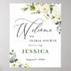 Accueillez vos invités à votre mariage avec l'Affiche de bienvenue pour une baby shower aux roses blanches et à la verdure florale, avec une verdure botanique aquarelle luxuriante et des fleurs blanches, avec "bienvenue dans notre bonheur éternel", vos noms et la date du mariage dans un mélange chic de typographies modernes et de calligraphie manuscrite.