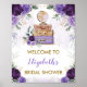 Panneau de bienvenue sur le thème du voyage pour une fête de mariage, une baby shower, un mariage, etc. avec des fleurs violettes à l'aquarelle élégantes, des valises vintage et un globe lavande