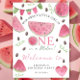 Kawaii et mignonne pastèque rose Fille 1er anniversaire Invitation de fête. Le design comprend des pastèques aquarelles, des drapeaux de vacances sur le thème de la pastèque, un coeur de pastèque, des graines de pastèque, "un dans un melon!" et une tranche de pastèque souriante d'aquarelle. Notre douce petite fille est une dans un melon !