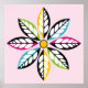 Décor Feuille-Fleur moderne, design d'affiche abstrait, avec une fleur ses pétales de feuilles colorés au centre jaune. Deux en noir, jaune, deux en noir, aqua/turquoise, deux en noir, rose fushia et deux en noir, vert citron. Dans chacune d'elles il y a des feuilles blancs plus petits. Cette affiche carré d'inspiration abstraite de la nature a une atmosphère rétro et est entièrement personnalisable et l'arrière - plan rose pâle peut être changé. Style d'art populaire primitif.