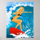 Cette blonde tannée sait comment surf. Fille à pattes longues sur une planche de surf rouge, chevauchant les vagues de l'océan.
