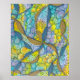 Cette affiche est une oeuvre d'art abstrait vibrante et captivante visuellement. Elle présente une interaction dynamique de formes, de lignes et de couleurs, créant un sentiment de mouvement et d'énergie. L'utilisation de l'aquarelle et de l'encre donne à l'oeuvre un aspect texturé et organique. L'oeuvre est dominée par une variété de formes tourbillonnantes et circulaires dans les tons bleu, violet et jaune. Ces formes se chevauchent et se tissent, créant un sentiment de profondeur et de complexité. Des lignes minces et courbes en brun et noir serpentent à travers l'oeuvre, ajoutant un sens de direction et de mouvement. Ces lignes créent également un sens de la structure et de l'ordre parmi les formes tourbillonnantes.
