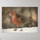 Cette affiche montre un collier de maison mâle debout dans la neige. Il a beau a le plumage rouge sur la tête et la poitrine. La neige s'accroche à son bec. L'arrière - plan lumineux est dans les tons or, gris, orange et blanc.