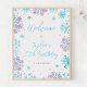 Ce panneau de bienvenue élégant et glamour pour la fête d'anniversaire présente des flocons de neige couleur violet et bleu imitation parties scintillant et des étincelles sur un arrière - plan blanc. Le texte combine écriture manuscrite et polices sans serif modernes pour un look élégant et sophistiqué. C'est parfait pour un anniversaire d'hiver ou de Noël. Graphiques par www.etsy.com/uk/shop/SunflowerDayLove