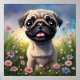 Joli chiot Carlin dans un champ de fleurs.