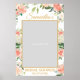 Ceci est un accessoire de photo pour une douche de nuptiale bohème de printemps avec un cadre d'affiche comportant des fleurs de pêcher épanouies et un arrangement de verdure fraîche avec des lettres scintillantes dorées
