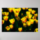 Fleurs de tulipe jaune et rouge sur un lit à fleurs. Jeu de soleil et d'arrière - plan vert foncé. Les tulipes ont l'air de brûler des bougies. La tulipe jaune est synonyme d'espoir, de gaieté et de sourire lumineux et énigmatique.