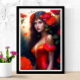 Portrait d'une belle fée rouge imaginaire avec des fleurs rouges sur ses cheveux. Art original par Gifts_AtTheCorner ©2023.