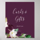 Ce panneau à l'encre violette "blooms plum cards and gifts" est parfait pour un mariage moderne ou une fête de mariage. Le design floral élégant présente des fleurs de tulipes violettes prune foncé et blanches avec des feuilles vert émeraude et des accents de feuilles dorées. La ligne de texte au bas du panneau peut être personnalisée avec la date, les noms des mariés, ou un court message comme "Merci". Ce panneau peut être utilisé pour un mariage ou tout événement ou fête.
