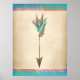 Flèche rustique avec plumes florales et turquoise qui s'écrase contre un arrière - plan beige texturé, avec garniture de motifs tribus néon coloré.