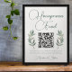 Un script de calligraphie verte tout simplement élégant avec deux feuilles d'eucalyptus aquarelle de chaque côté pour décorer cette belle affiche minimaliste de fonds de lune de miel mariage de automne. Jolie signalisation mariage moderne avec votre code QR de votre site web pour une occasion de jardin la nuit.