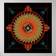 Sun, Giver of Warmth & Life; Round of Eagle Feathers connote relation avec Sun, Life’s Circle et Creator. Au centre se trouve le soleil et le Four Winds. Le rouge, le noir, le jaune et le blanc représentent les quatre peuples de la Terre Mère. Quatre rayons émettent la puissance du Créateur du Cercle de Vie. Quatre est un nombre sacré incarné dans la Terre avec ses quatre directions ; dans l'année, avec ses quatre saisons ; dans le jour, avec le lever du soleil, midi, soir et nuit ; dans la vie, avec ses quatre divisions : Enfance, jeunesse, masculine et vieillesse. Tout est lié dans un Cercle de Vie et d'Amour, sans commencement, sans fin. Les quatre flèches dépeignent le pouvoir de briser tout lien qui entrave l'harmonie de la Vie.