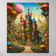 Dans cette image, un conte de fées se déroule dans une forêt enchantée, où un château majestueux jaillit du sol comme s'il était cultivé sur la terre même. Les pierres du château sont ornées de détails fantaisistes et ses toits coniques sont surmontés de tons rouges et bleus vifs. Autour du château se trouvent de grands arbres et des champignons géants, dont certains servent de maisons eux-mêmes, avec des fenêtres et des portes. Une montgolfière flotte doucement dans le ciel, ajoutant à l'atmosphère onirique. De petites figures, peut-être des fées ou des denizens de bois, peuvent être vues dans diverses activités autour du château, insufflant la scène avec la vie. Le chemin qui mène à la grande entrée du château est bordé de fleurs luxuriantes et de lanternes, ce qui laisse croire à une aura accueillante pour cette demeure magique.