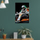 A close-up portrait of a Formula 1 racing driver wearing a white and orange suit and helmet, seated in a race car against a dark background. Clear details and vibrant colors enhance visual appeal.