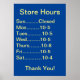 Grand Signe à afficher dans votre fenêtre. Permet aux gens de connaître vos heures. Une encre résistante à l'éclat, ne gaspillez pas votre argent sur les autres ! Totalement personnalisable. S'il vous plaît "signet" ce site, merci. Découvrez quelques-uns de nos autres grands designs !