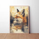 L'image représente un gros plan d'un renard rouge les yeux fermés, submergé dans un plan d'eau. La fourrure du renard est un orange vif aux accents blancs, et ses oreilles sont percées. L'eau est d'un brun et gris muet, reflétant la lumière du feuillage environnant. L'arrière - plan est un doux flou de teintes dorées et marron, suggérant un cadre forestier.