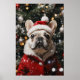 L'image montre un bulldog français vêtu de manière festive pour Noël, portant un chapeau de Père Noël rouge et un manteau assorti avec un garnissage en fourrure blanche. L'arrière - plan est décoré d'un sapin de Noël avec des lumières et des ornements brillants, tandis que de la neige douce semble tomber autour du chien, créant une atmosphère de vacances douillette et joyeuse.