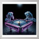 Cue up the cosmos. This surreal sci-fi artwork features two astronauts playing pool on a glowing galaxy table, with planets as billiard balls and a spiral nebula at the center. Set in a low-gravity dreamscape with neon purple lights and floating visors, it’s a playful mashup of space exploration and human leisure. Perfect for fans of cosmic humor, futuristic fantasy, and interstellar vibes. Great on stickers, tees, and wall art — because even astronauts need a break.