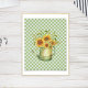 Pretty country / farmhouse design fea watercolor illustration of a garden watering can filled with a bouof sunflowers on mint green and white checkerboard background