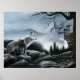 Deux loups assis dans les rochers devant un château. Des montagnes autour d'eux.