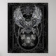 Une puissante chouette ailée s'envole au-dessus d'un crâne orné de clés. Le hibou est encadré par des motifs tourbillonnants et complexes, des chaînes et une croix celtique. La palette de couleurs monochromatiques ajoute à l'atmosphère dramatique de l'image.