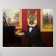 Ce design présente German Shepherd élégamment vêtu d'un manteau de grenouille noire, chemise blanche, près du piano, contre un mur rouge avec des peintures dans des cadres dorés.