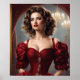Gia Cette image présente un portrait époustouflant d'une femme exubérant le glamour du monde ancien, parfait pour un Pinterest board sur le thème de la mode et de la beauté historiques. Elle porte une robe rouge riche, détaillée avec des broderies complexes et des manches bouffées qui se glissent de l'épaule, soulignant une esthétique romantique et royale. Ses cheveux sont stylisés en vagues volumineuses qui encadrent son visage élégamment, jumelés au maquillage classique avec une lèvre rouge audacieuse et des yeux fumés captivants. Des boucles d'oreilles ornées de bijoux apportent une touche pétillante qui complète le thème luxueux. L'ensemble offre un aperçu d'une salle cossue avec un grand lustre, qui se reflète dans un miroir doré qui rehausse l'atmosphère somptueuse. Les étiquettes de cette image pourraient inclure : #RenaissanceFashion, #VintageGlamour, #RegalBeauty, #HistoricalPortrait, #LuxuryGown, #FashionArt, #ElegantHairstyle, #ClassicMakeup, #ChandelierLighting, #RoyalAesthetics.