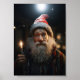 Porait photo de super gentil gnome de Noël à l'air surpris dans l'objectif de l'appareil photo tenant une bougie