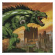 Un grand dragon vert de Kaiju (ou dinosaure, si vous voulez) à la Godzilla surplombe une grande ville fantastique.