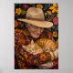 L'illustration présente un homme âgé portant un casquette Borsalino élégant et une chemise à fleurs vibrante. Il berce doucement un chat rouge dans ses bras, dégageant chaleur et affection. Son expression sereine suggère un moment calme et paisible entre l'homme et son compagnon de félin.