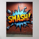 Cette pièce, née de l'énergie brute de l'art urbain, est un témoignage de la puissance d'un seul moment d'impact. Ce n'est pas juste un mot, c'est un événement figé dans le temps, qui capte l'instant même d'un puissant "SMASH !" Le rendu détaillé des débris brisés qui s'envolent vers l'extérieur, combiné aux couleurs vives et aux lignes pointues, donne au spectateur un sens viscéral de la force et du chaos impliqués. Ce qui le rend spécial est la fusion de deux styles distincts : l'action explosive de la bande dessinée et l'esprit rebelle du graffiti. L'arrière - plan murale en brique place la pièce dans une esthétique d'art de rue, tandis que le lettrage propre, audacieux et dynamique starburst la fait apparaître avec une énergie graphique qui est à la fois nostalgique et moderne. C'est une célébration de l'action audacieuse, un point d'exclamation visuel qui déclare sa présence avec un style et une force incontournables.