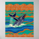 Impression artistique de qualité muséale. Gravure sur bois japonaise de style japonais avec texture de grain de bois visible et motifs de vagues représentant une baleine à bosse faisant une cabriole, créée dans des tons de bijoux avec des accents dorés. Cadre non inclus.