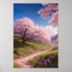 Une scène pittoresque se déroule alors qu'un chemin de terre serpente entre des collines verdoyantes et de majestueux cerisiers en fleurs. La grandeur de la nature entoure ce sentier enchanteur, avec des teintes vibrantes et des fleurs délicates qui guident votre voyage. Cette oeuvre d'art reflète harmonieusement la beauté naturelle et la tranquillité, vous invitant à explorer l'allure douce du sentier qui vous mène à travers un paysage serein de collines ondulées et d'arbres en fleurs.