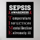 Cette conception est dédiée à la sensibilisation à la septicémie. L'audacieux guide T.I.M.E. rappelle avec force les principaux symptômes : la température, l'infection, le déclin mental et l'extrême maladie. Parfait pour les médecins, les infirmières et les professionnels de la santé. Montrez votre soutien et aidez à sensibiliser les gens à cette maladie mortelle.
