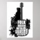 Une silhouette de guitare avec arrière - plan grunge, tourbillons et noms de styles musicaux. Pour les mélomanes.