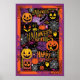 Illustration vibrante et complexe des motifs d'Halloween, avec une variété de symboles iconiques tels que les lances jack-o-lanternes, les chauves-souris, les araignées et les toiles, dressés contre un arrière - plan orange et violet chaleureux et sinistre, avec des lignes audacieuses, des formes géométriques et des polices stylisées, avec des tons noir, jaune et rouge pour créer une atmosphère festive et éffrayante, avec des détails et des textures complexes qui évoque l'esprit de la saison d'Halloween.