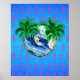 Conception surf d'un surfeur survolant une vague, encadrée de palmiers tropicaux. Arrière - plan bleu océanique et tortues de mer hawaïennes d'honneur rose et motif de masques Tiki.