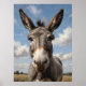 A warm and expressive portrait of a curious donkey set against a blue sky, evoking charm and tranquility in a rural setting.