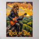 Cette oeuvre d'art dynamique représente un lion, qui a l'air sans effort cool dans les lunettes de soleil et une veste en cuir, "déchiquetant" magistralement une guitare électrique perchée sur une roche. La scène se déroule à travers des collines verdoyantes et des arbres éloignés sous un vaste ciel ensoleillé. L'impasto épais et expressif crée une texture tangible, faisant résonner la déclaration "Rock or Die" avec l'énergie brute de la performance.