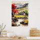 Des teintes vives dansent à travers une campagne japonaise, une toile de couleur. Les berges rocheuses bercent le ruisseau qui serpente à travers ce panorama idyllique. Nichée sous les collines, une petite maison en bois évoque des histoires de tranquillité et de simplicité.