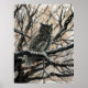 Une grande chouette à cornes dans les branches d'hiver nues d'un arbre.