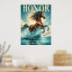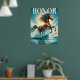Un étonnant cheval de châtaignier, à crinière qui coule, passe à travers une eau turquoise claire, rayonnant de force et de beauté. La lumière du soleil éclaire les éclaboussures, créant une scène dynamique et vibrante face à un ciel bleu tranquille avec des nuages doux. En haut, "Honneur" se dresse audacieusement dans un élégant script jaune, symbolisant la dignité et le courage. Sous le cheval, la citation inspirante d'Aristote — "La dignité ne consiste pas à posséder des honneurs, mais à les mériter." — est gracieusement affichée en caractères jaunes, avec son nom en caractères plus petits. Encadrée par des bordures noires épurées, cette affiche célèbre la liberté, la force et la résilience.