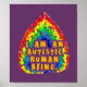 "Je suis un être autiste" en orange contre une flamme arc-en-ciel en mosaïque et un arrière - plan bleu foncé.