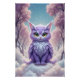 Illustration d'un majestueux hybride de Chouette céleste, d'imaginaire blanc et très détaillé. La créature a une fourrure violette moelleuse aux accents fluides de plumes blanches et des yeux brillants vert-jaune. Il s'assied sereinement sur un nuage doux et volumineux de couleur pastel dans les tons rose, lavande et bleu clair. L'arrière - plan est doté d'une forêt magique onirique, d'arbres fins et stylisés, de roses douces, de fines fleurs jaunes pâles et d'un ciel pastel parsemé d'étoiles scintillantes. Un éclairage doux et diffuse met en valeur des textures complexes en fourrure et en plumes, créant une atmosphère éthérée et fantastique.